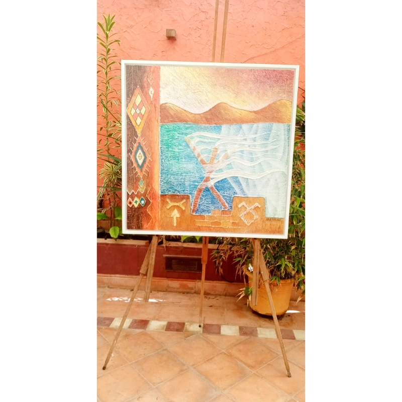 Dans cette œuvre, Brahim Adnor explore la profondeur de la mémoire collective amazighe à travers une composition riche en symboles et en textures. Les formes organiques et les signes géométriques se répondent dans un mouvement vibrant, évoquant la fusion entre le passé et le présent. Les nuances chaudes, mêlées à des éclats lumineux, traduisent un dialogue entre la terre et la spiritualité, entre l’humain et son héritage.