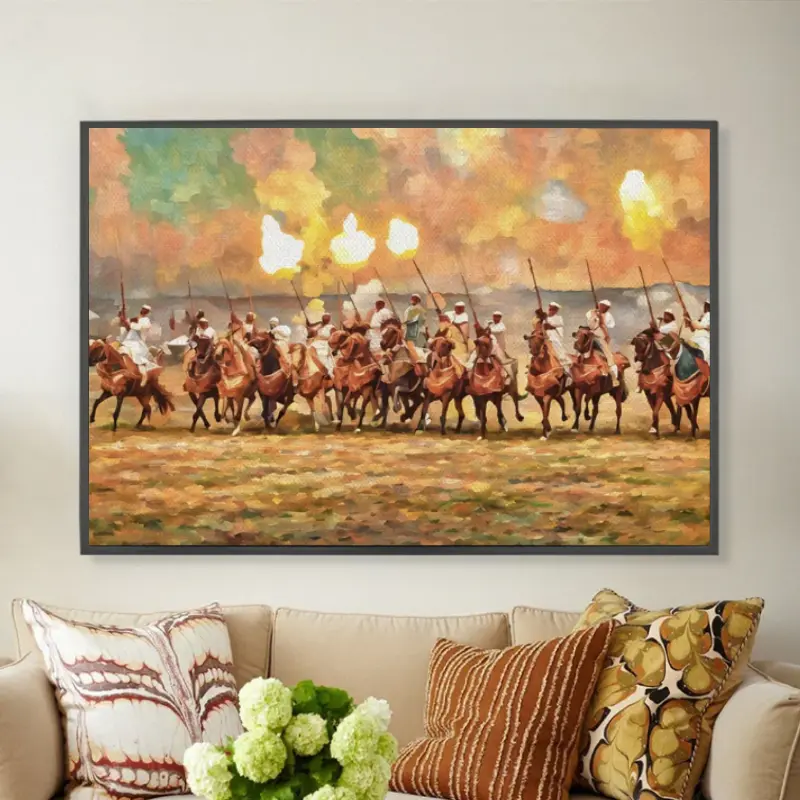 Tableau artistique marocain – Cavaliers traditionnels au coucher du soleil